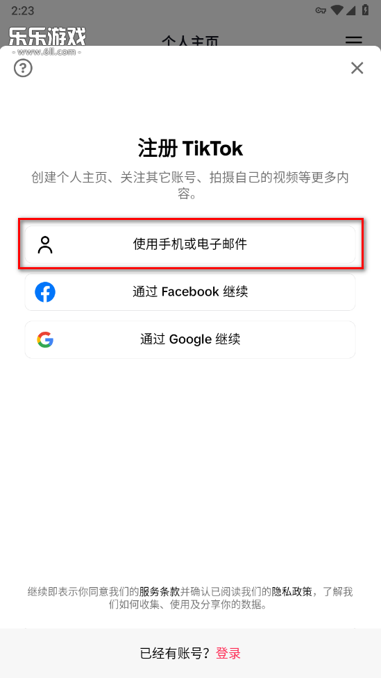 3. 可使用Google账号直接登录;这里以手机或电子邮件注册为例。