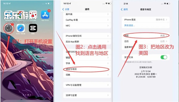 ③ 进入手机设置,选择通用,找到语言与地区选项,将地区修改为美国。