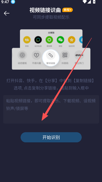 2、复制抖音视频的音乐链接地址,在浮浮雷达中点击开始识别,等待片刻即可完成提取。