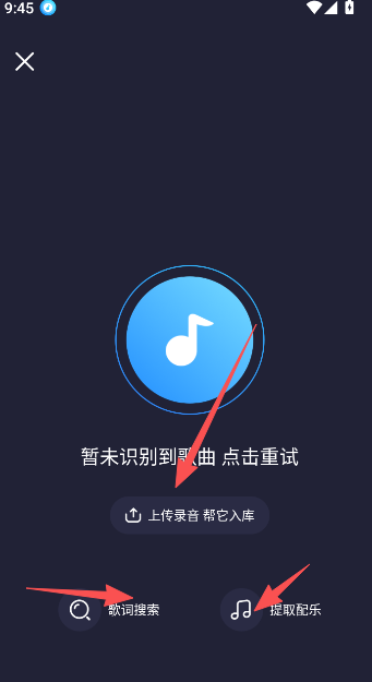 3、若提示未识别到歌曲,可点击重新识别,或尝试通过歌词搜索、提取配乐等方式进行识别。