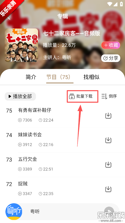 4、在节目详情页中,找到并点击“批量下载”功能键。