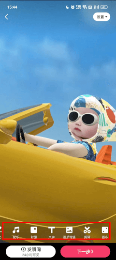 你可以选择下方的功能栏目,给视频添加配乐、插入文字、裁剪片段等;