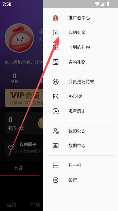 3、在右侧出现的列表中,点击“我的佣金”选项,查看赚钱任务与分享攻略。