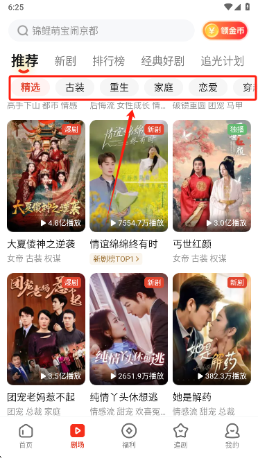 2、点击顶部导航栏可以切换不同的短剧分类