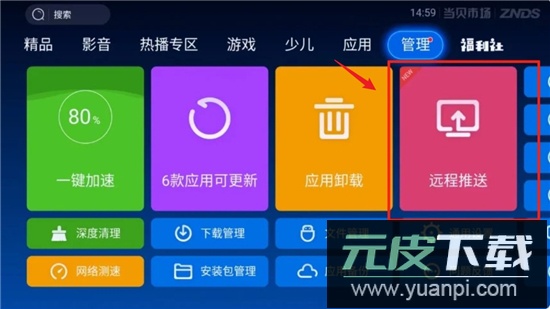 第1步:如电视机已安装当贝市场,提前下载好追光视界安装包,然后打开当贝市场,首页【管理】中找到【远程推送】功能;