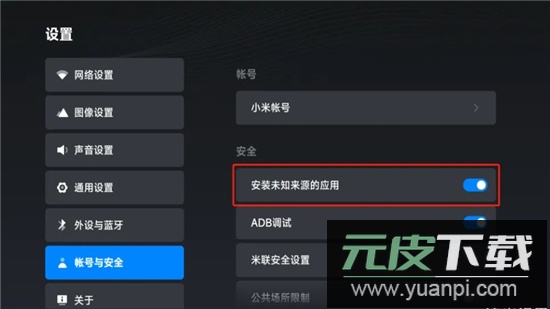 2、在小米盒子的【设置】-【账号与安全】里,选择允许安装未知来源的应用;