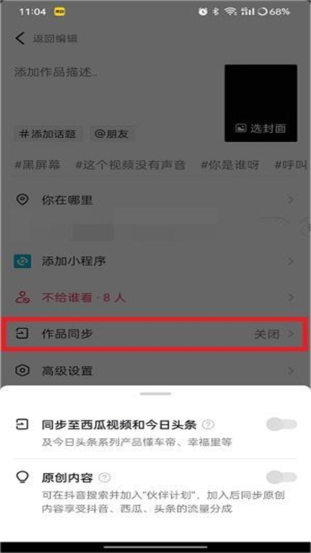 5、建议开启作品同步功能,便于内容同步至青桃;填写描述并设置权限,最后点击发布。