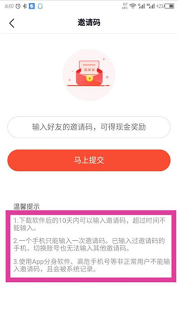3 在邀请码填写页面,输入好友提供的邀请码,点击马上提交按钮。