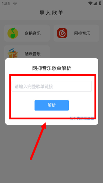将完整的歌单链接输入到指定框内,点击【解析】按钮即可完成导入。