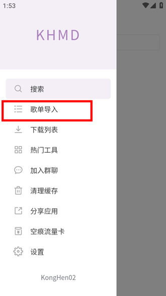 打开空痕音乐KHMD应用程序,在主界面找到【歌单导入】功能并点击。