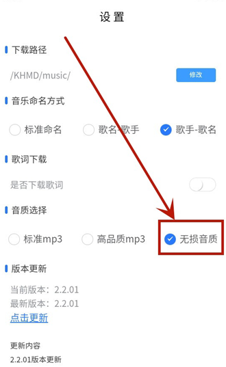 在设置中勾选无损音质,之后下载歌曲时便会自动保存为高品质音乐文件。