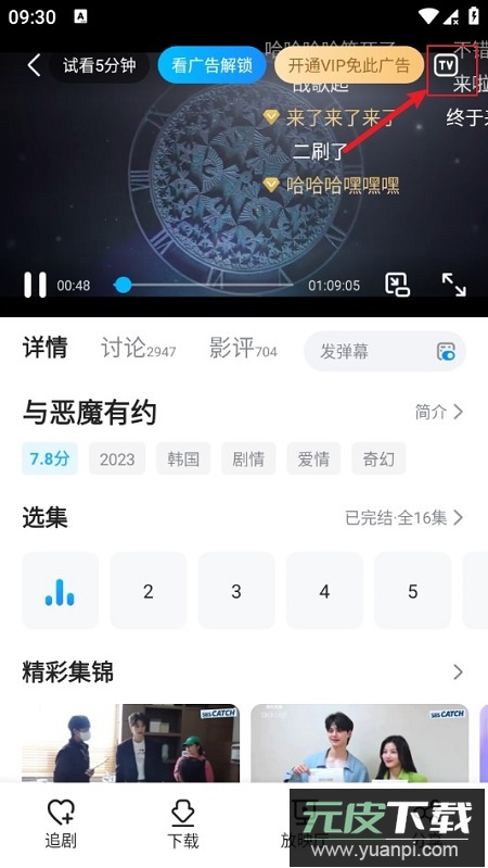 3、进入视频播放界面后,找到视频右上角的TV标识,点击该标识;