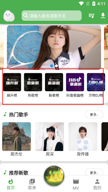打开软件进入首页,可以浏览各类音乐排行榜;
