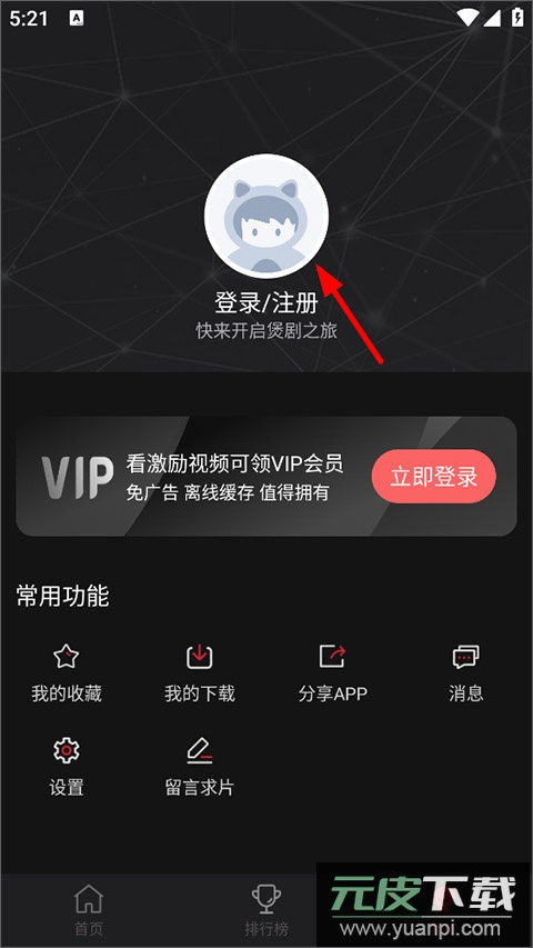 2、在“我的”页面中,点击用户头像区域,完成注册或登录操作;
