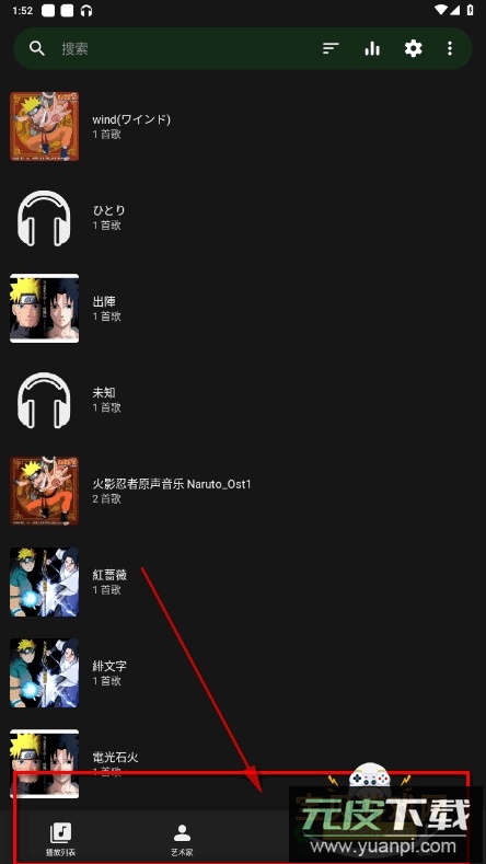 2.应用底部导航栏依次排列着播放列表、艺术家、专辑与歌曲入口。
