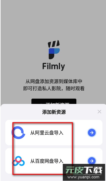 进入应用首页,点击添加资源选项,您可以看到百度网盘和阿里云盘等接入方式。