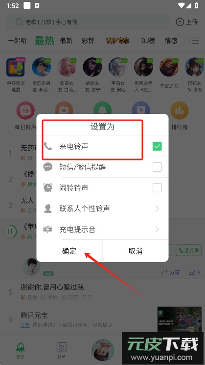 3、在弹出的确认界面中点击确定即可完成铃声设置。