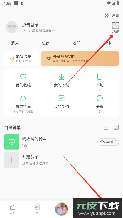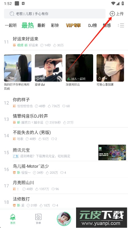 1、打开铃声多多应用,点击首页右上角的上传入口。