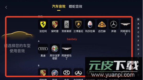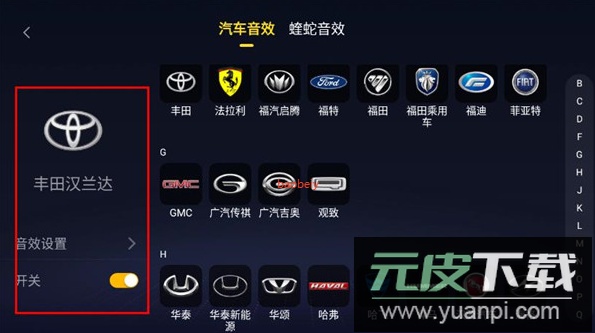进入音效设置页面后,选择对应的车型,系统会为该车型匹配专属音效。