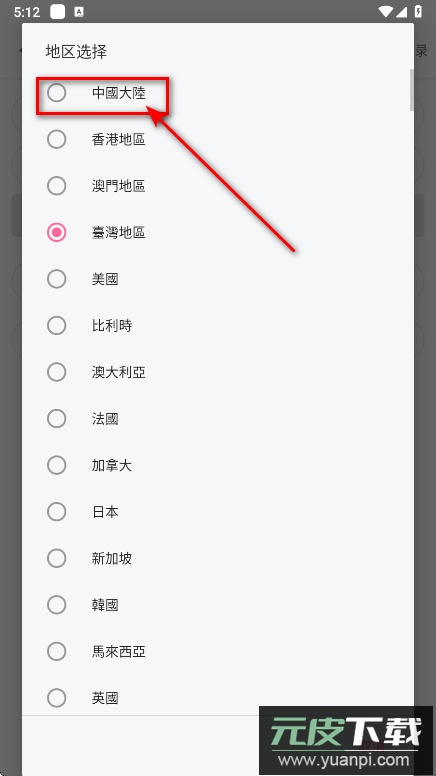 4. 从列表中找到并选择中国大陆。