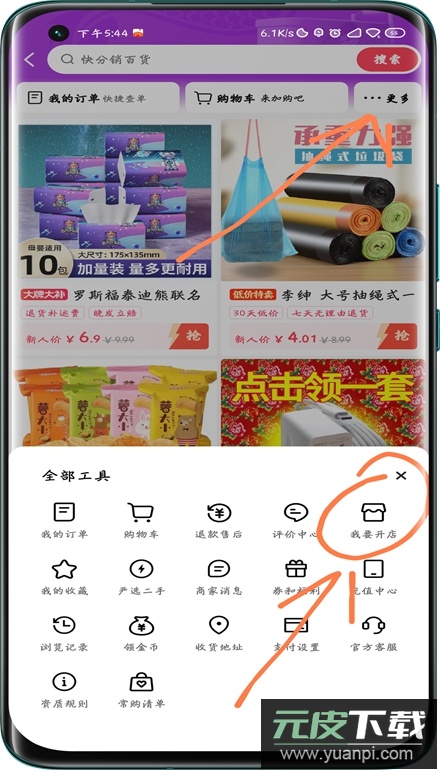 3、进入快手小店页面之后,点击右上角的更多按钮,屏幕下方会弹出多个功能选项,在里面找到我要开店的入口;