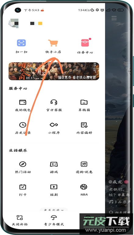 2、在新弹出的侧边栏窗口里,找到并点击快手小店选项;