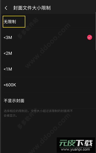 在封面文件大小限制的设置页面中,选择“无限制”即可完成设置。