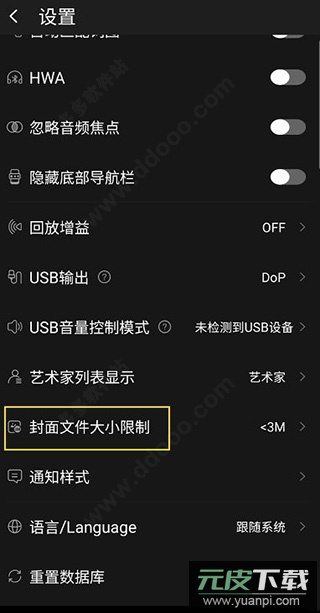 在设置菜单中找到“封面文件大小限制”选项并点击进入。