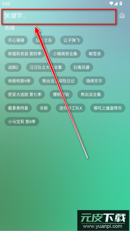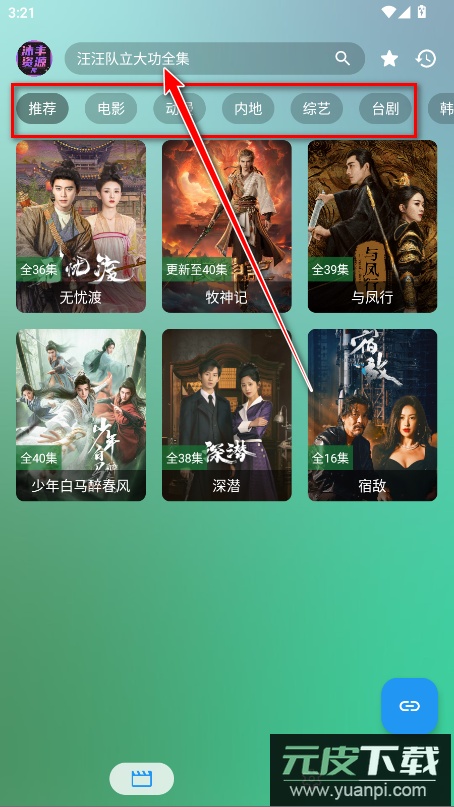 1.打开软件,首页上方分布着推荐、电影、综艺、动漫、内地等分类板块,点击顶部的搜索框。