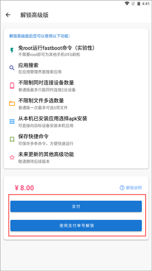 1、解锁说明:同一时间一个订单仅限解锁一台设备;如需更换设备,需先在已解锁设备上取消解锁。若对已解锁设备进行刷机、恢复出厂设置、双清、ROOT或解锁BL等操作,必须先取消解锁状态,否则支付单号将失效;卸载应用或清除数据不影响单号有效性。支付单号是解锁高级功能的唯一凭证,请妥善保存。