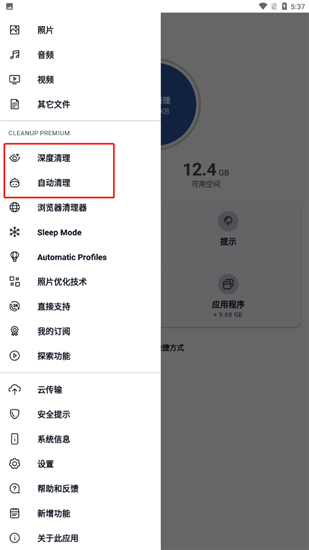 4、如需深度或自动清理,可点击首页左上角菜单图标,选择对应功能即可。