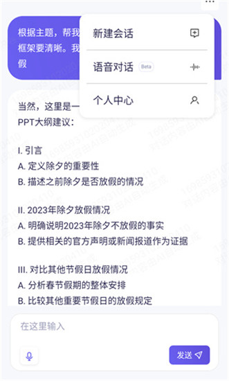 4、点击界面右上角可开启新对话、使用语音功能或进入个人中心;