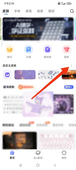2、点击“自定义皮肤”右侧的箭头图标进入设置;