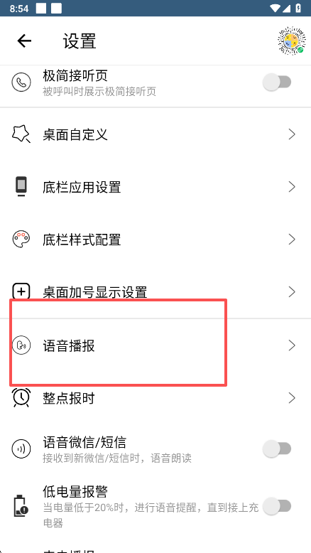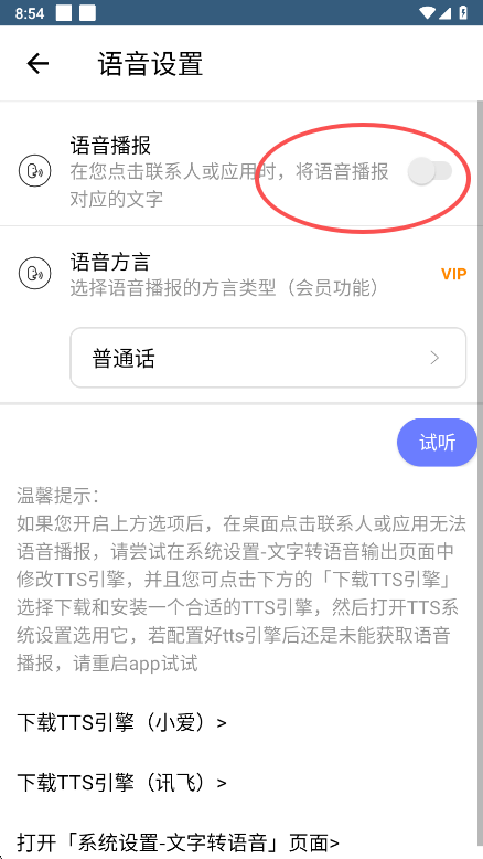 3、在语音播放设置界面内,点击开启开关即可激活语音播报功能。