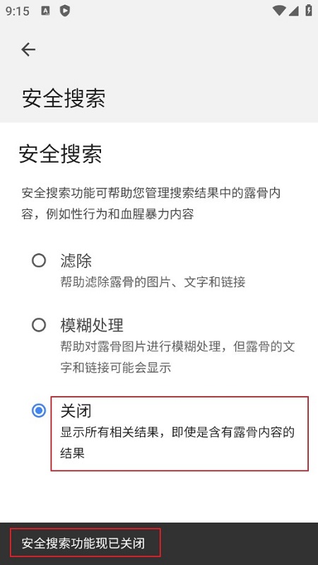 6.检查设置:重新搜索一些关键词,确认安全搜索已经被关闭。如果搜索结果中不再显示安全搜索过滤器,说明你已成功关闭安全搜索。