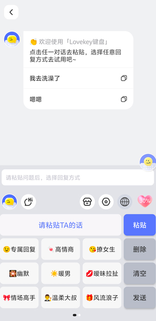 【lovekey键盘】复制聊天框的对话内容,点一下键盘对应按钮,系统自动生成适配的回复内容