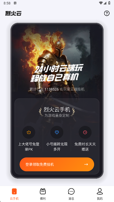 烈火云手机是一款专注于游戏场景的云手机,提供7×24小时全天候离线托管运行,游戏进程可持续后台执行。它配备海量云端存储空间,保障用户数据安全备份;同时支持跨设备同步,无论是在手机、平板或电脑上,均可随时访问云端应用与数据。