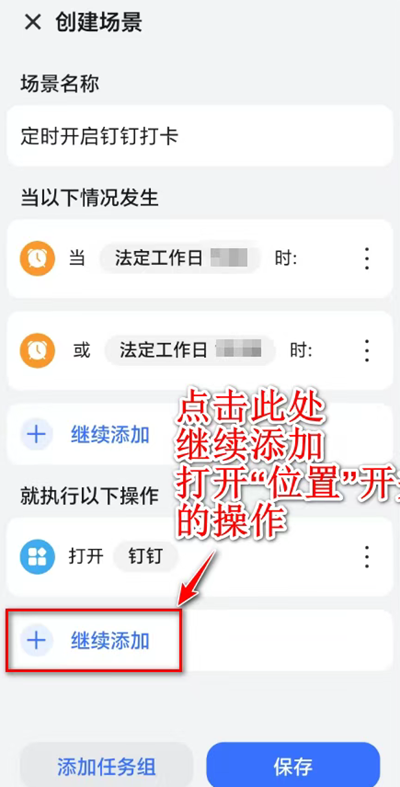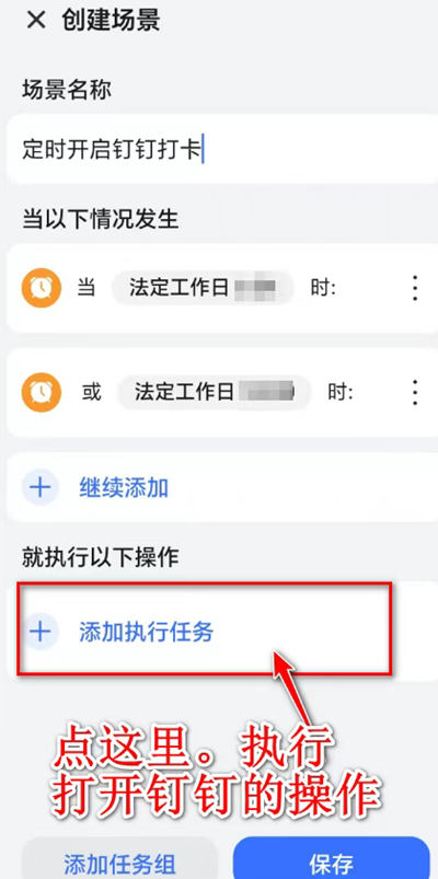 选择完成后,返回场景设置主界面。仔细检查所有设置,确认无误后,点击下方的“保存”按钮,将辛苦设置的“定时开启钉钉打卡”场景添加到个人智慧场景列表中,使其生效。