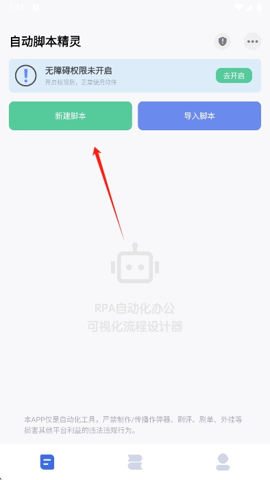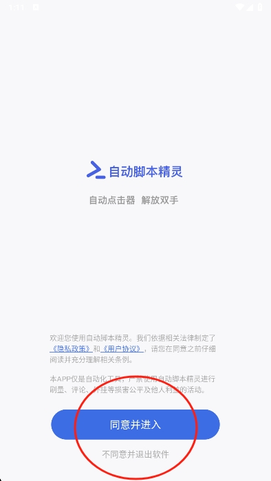 1、若要创建自动脚本,需先下载并打开软件,同意协议后进入;