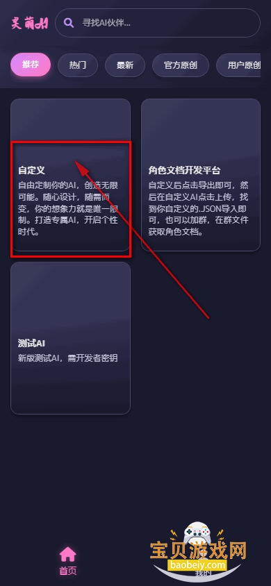 4.进入首页点击自定义选项,即可开始与虚拟角色对话。