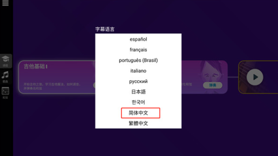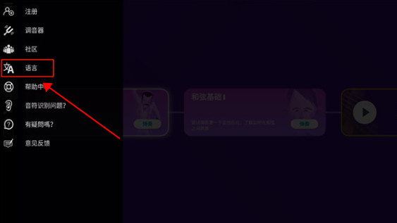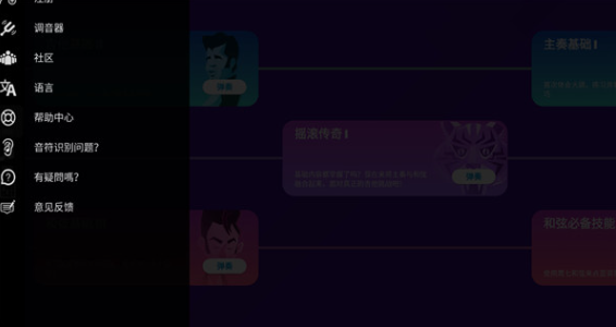 点击左上角,我们可以自己设置语言、调音器等,还能进入社区和其他吉他爱好者一起学习。