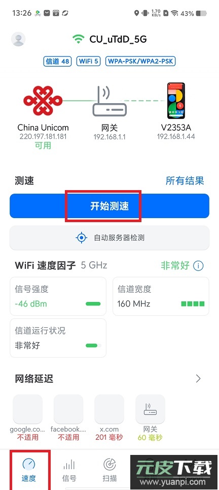 2、打开WiFiman应用,在主界面找到并点击开始测速按钮,应用将自动运行测速功能。