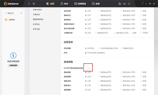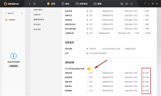 在隐私设置右侧,找到“游戏历程”分类下的“以下各子项全部设为私密”,将其右侧的开关按钮开启;