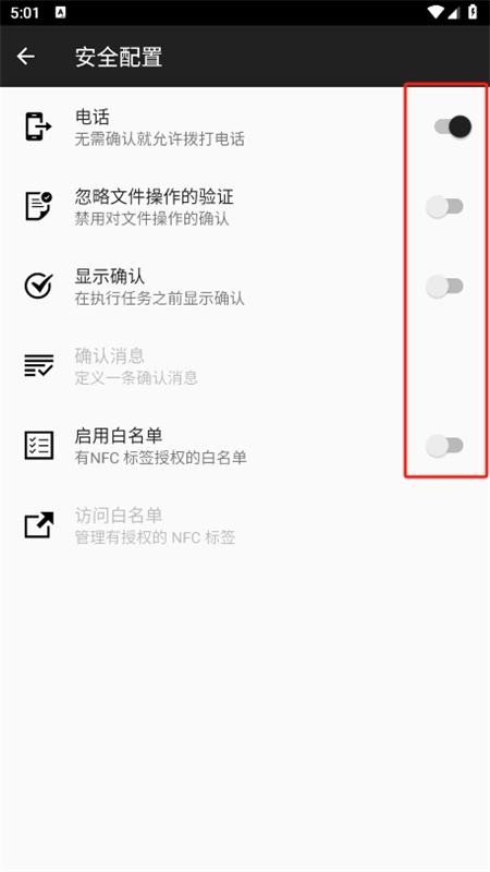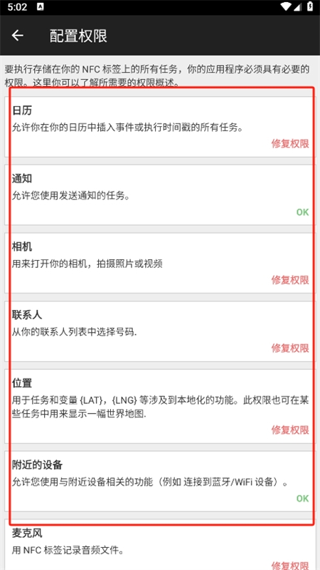 4、若要执行储存在NFC标签上的全部任务,应用需获得相应权限,这需要开启配置权限页面进行调整。