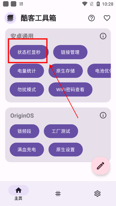 2、操作步骤:打开酷客工具箱,点击“状态栏显秒”功能。
