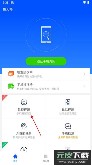 1、启动鲁大师手机版,点击页面上方的性能评测入口;