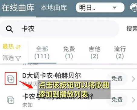 在曲库中找到想演奏的歌曲后,点击歌曲左侧的加号即可将其加入播放列表。