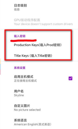 2、完成下载后,请打开模拟器的设置界面,向下滑动找到“载入密钥”选项,随后分别进入文件夹选择并载入prod.keys与title.keys这两个文件。