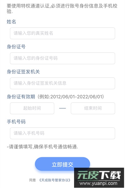 确保已安装“天成账号管家”应用,打开APP后点击“特权通道”进入认证界面。
