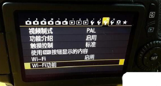 1、按下相机左上角的Menu菜单键,在设置中找到Wi-Fi功能选项;将默认关闭的Wi-Fi状态切换为启用,并点击SET或OK确认,即可开启相机的无线网络功能。